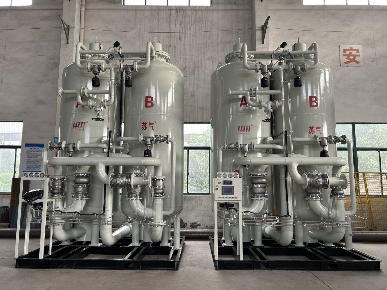 環(huán)境空氣經(jīng)壓縮凈化,除去油、水、塵后,進(jìn)入由兩個(gè)裝填有碳分子篩的吸附塔組成的變壓吸附裝置。壓縮空氣由下至上流經(jīng)吸附 塔,其間氧分子在碳分子篩表面吸附,氮?dú)庥晌剿隙肆鞒?,進(jìn)入粗氮緩沖罐,經(jīng)過(guò)一段時(shí)間后,吸附塔中碳分子篩被吸附的氧飽和,需進(jìn)行再生。再生是通過(guò)停止吸附步驟,降低吸附塔壓力來(lái)實(shí)現(xiàn)的。兩個(gè)吸附塔交替進(jìn)行吸附和再生,從而確保氮?dú)獾倪B續(xù)輸出。