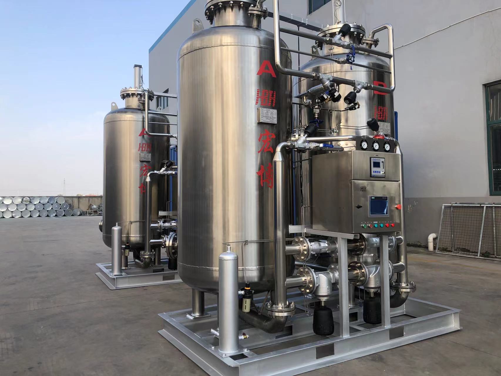 食品制氮機(jī)是以空氣為原料,以優(yōu)質(zhì)碳分子篩為吸附劑,運(yùn)用變壓吸附原理(PSA),利用充滿微孔的分子篩,對(duì)空氣進(jìn)行選擇性吸附,以達(dá)到氧氮分離的目的。分子篩在加壓時(shí)氧被優(yōu)先吸附,氮從非吸附相得到。這樣在氣相中可獲得氮的富集成分。因此利用碳分子篩對(duì)氧和氮在某一時(shí)間內(nèi)吸附量差別的這一特性,由自動(dòng)控制軟件按特定時(shí)間程序進(jìn)行加壓吸附,常壓解析的循環(huán)過(guò)程,完成氧氮分離,從而獲得高純度的成品氮?dú)狻?/span>